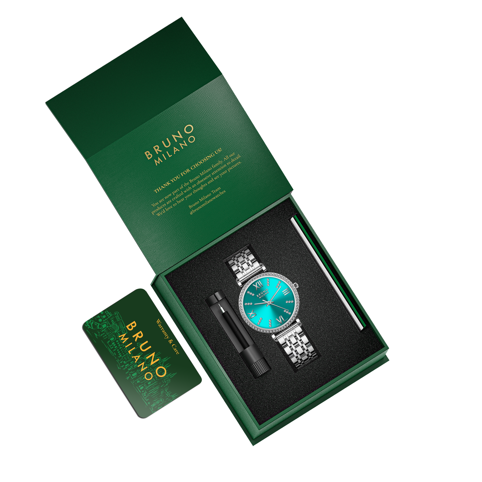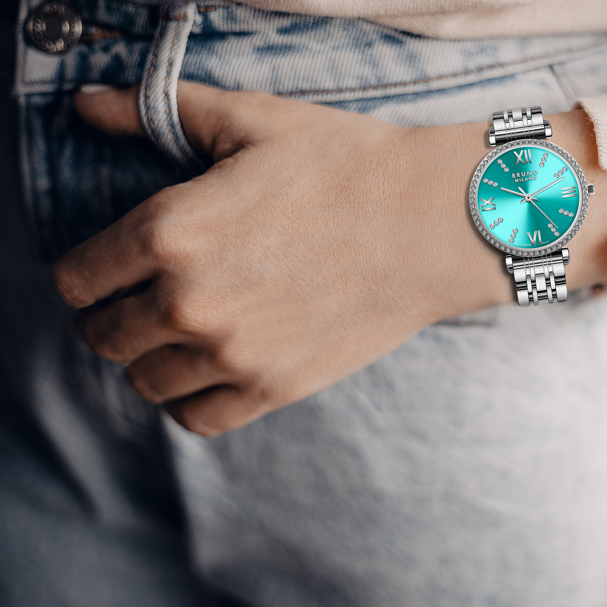 Introducing the epitome of elegance and luxury – the Women’s Diamond-Studded Watch with a Stunning Turquoise Dial. This exquisite timepiece is designed to captivate and mesmerize, making it the perfect accessory for the sophisticated woman who appreciates the finer things in life.
