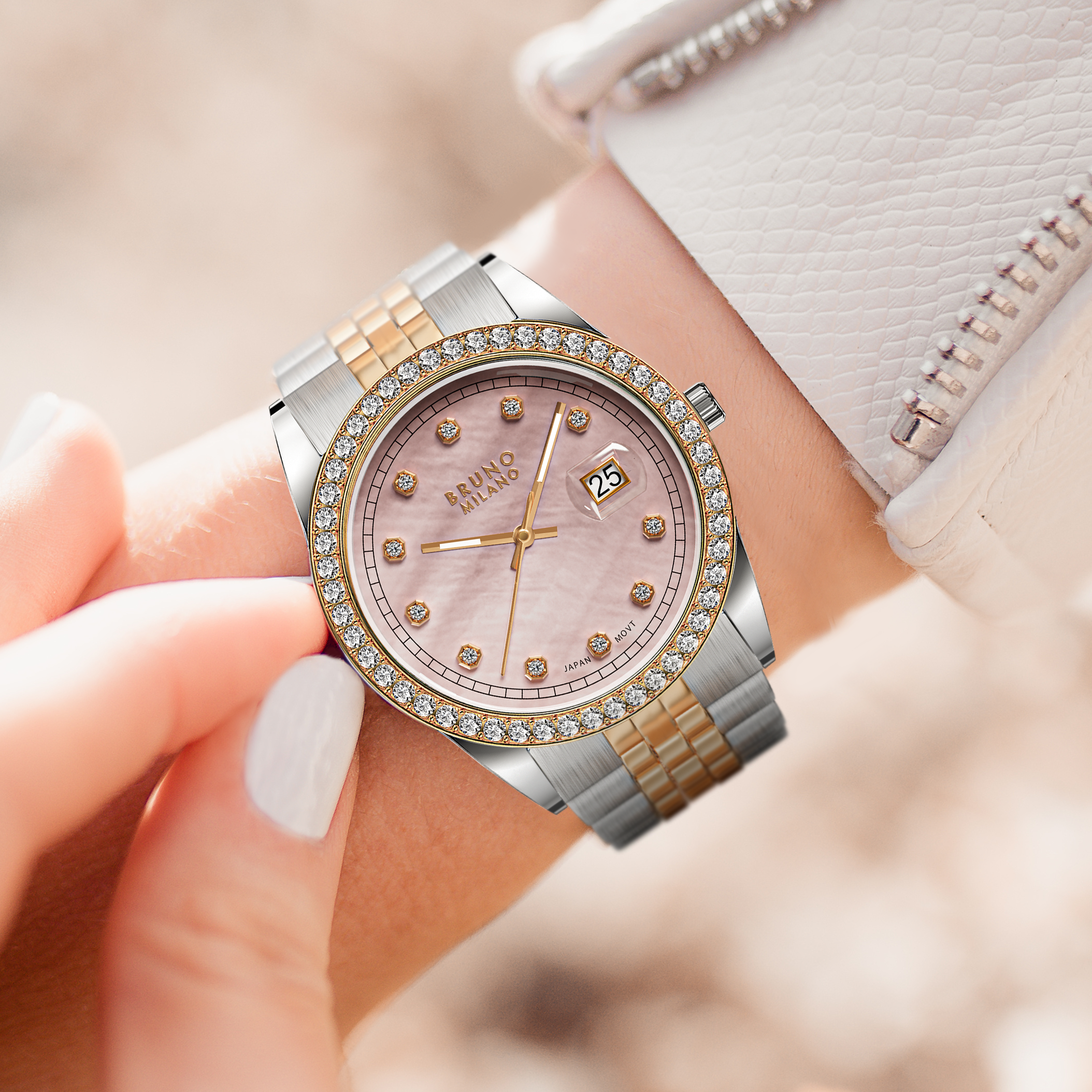 Whether worn for a special occasion or to add a touch of elegance to your everyday ensemble, this watch is sure to turn heads and make a lasting impression. The combination of the shimmering silver and rose gold tones, the captivating pink mother of pearl dial, and the radiant diamonds creates a look that is both classic and contemporary, perfect for the modern woman with a discerning eye for style.