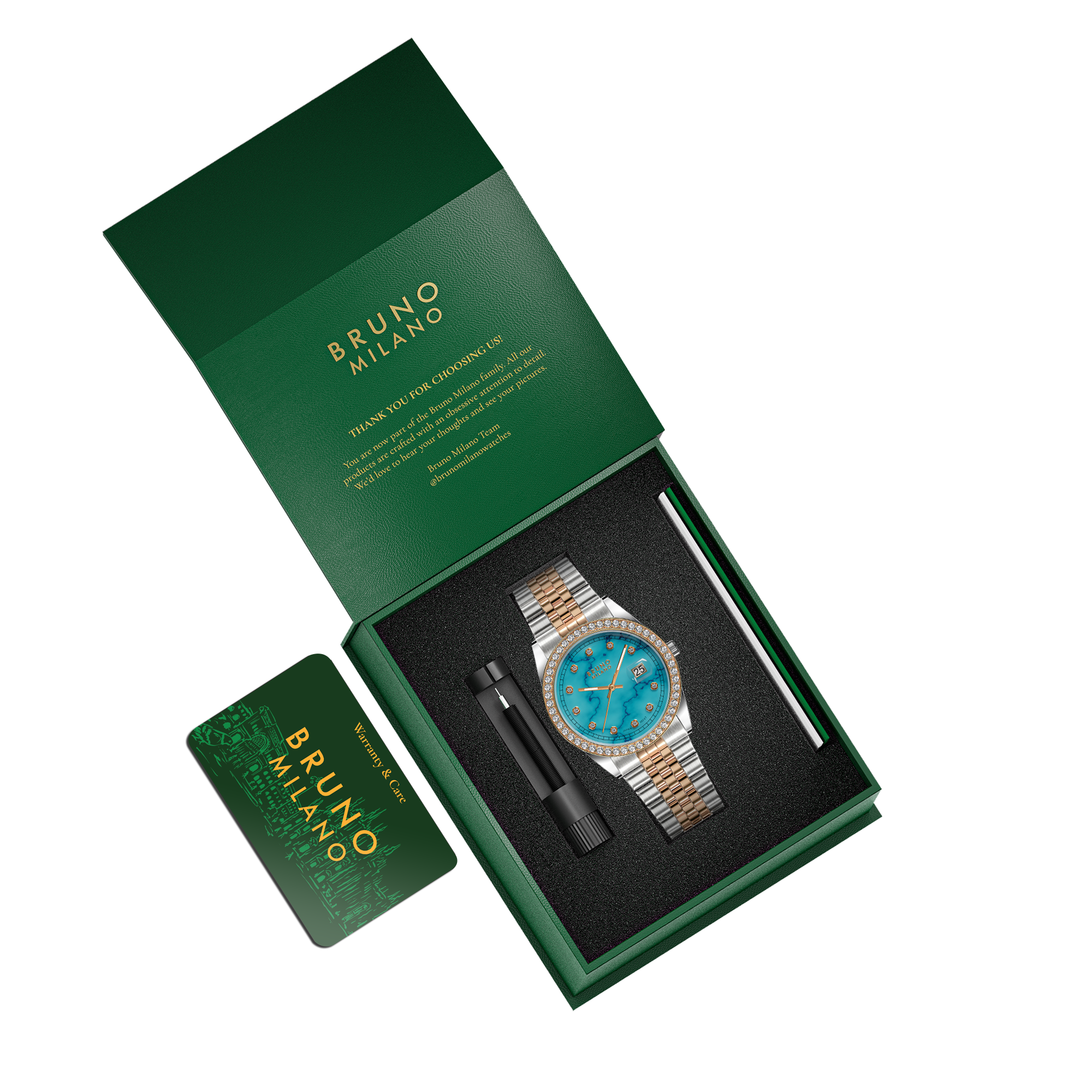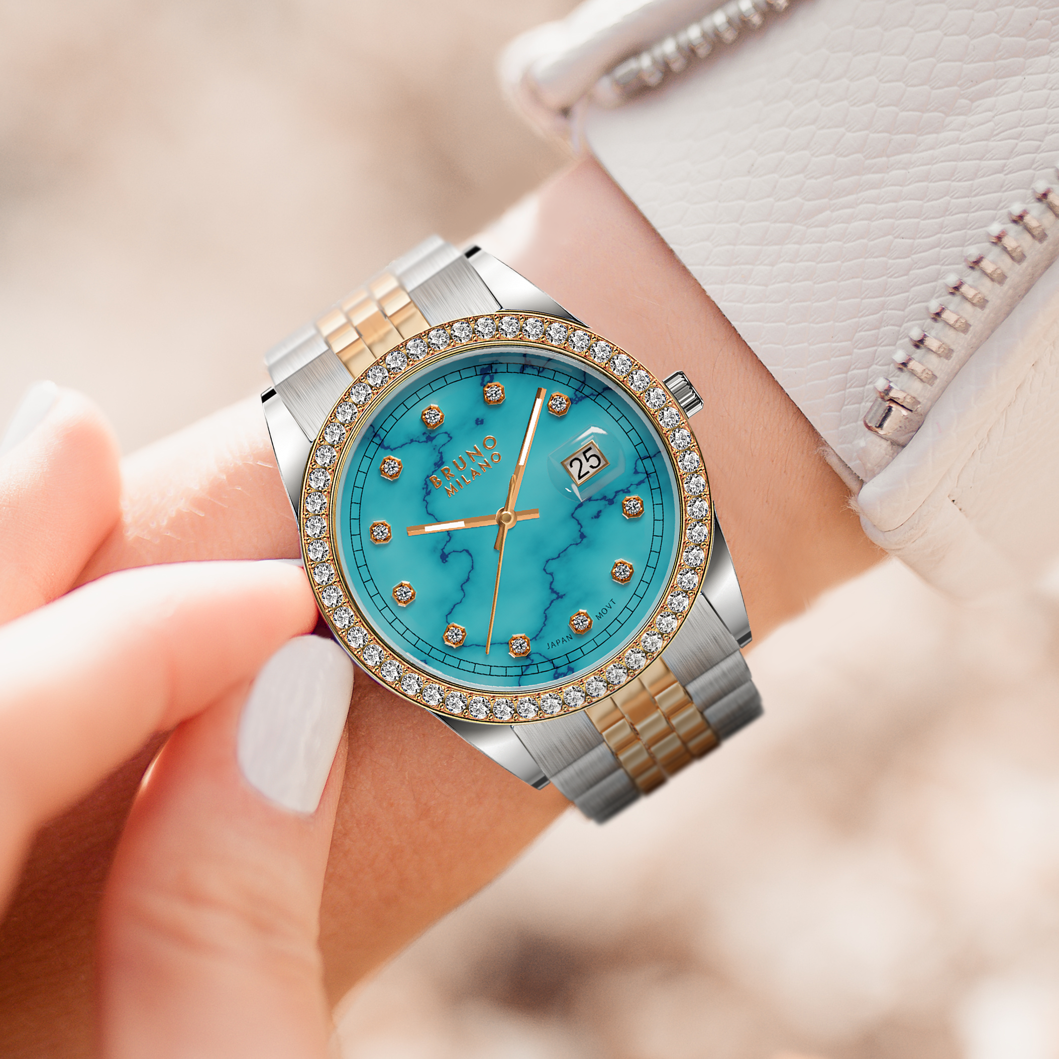 Whether worn for a special occasion or to add a touch of elegance to your everyday ensemble, this watch is sure to turn heads and make a lasting impression. The combination of the shimmering silver and rose gold tones, the captivating turquoise dial, and the radiant diamonds creates a look that is both classic and contemporary, perfect for the modern woman with a discerning eye for style.